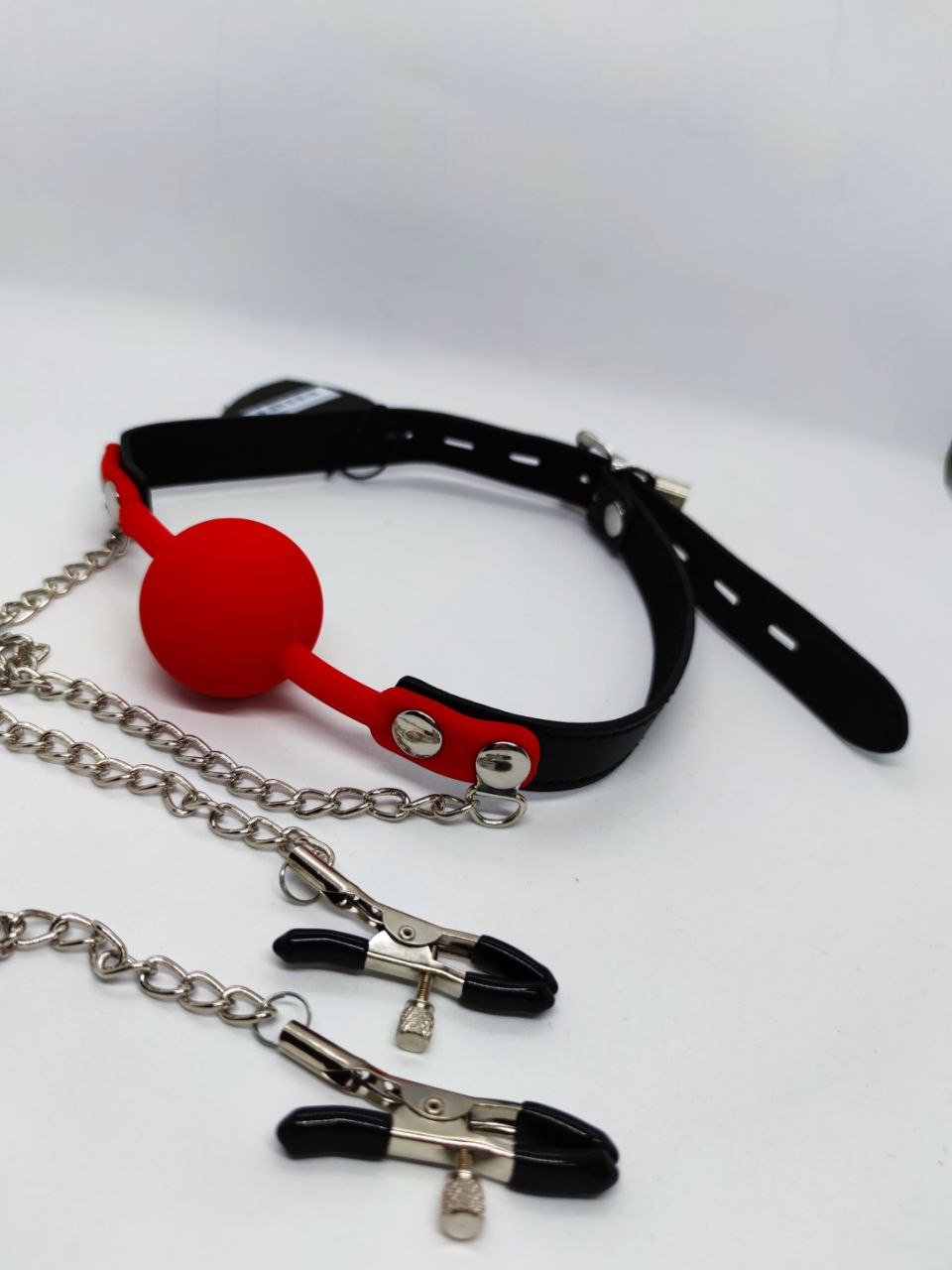 Відмінний варіант багатофункціонального аксесуара! Пропонуємо купити кляп з силіконовою кулькою та затискачами для сосків, який чудово доповнить ваш БДСМ-арсенал.
