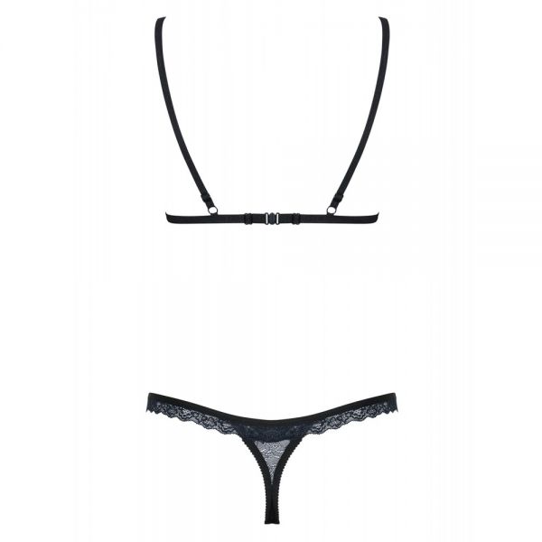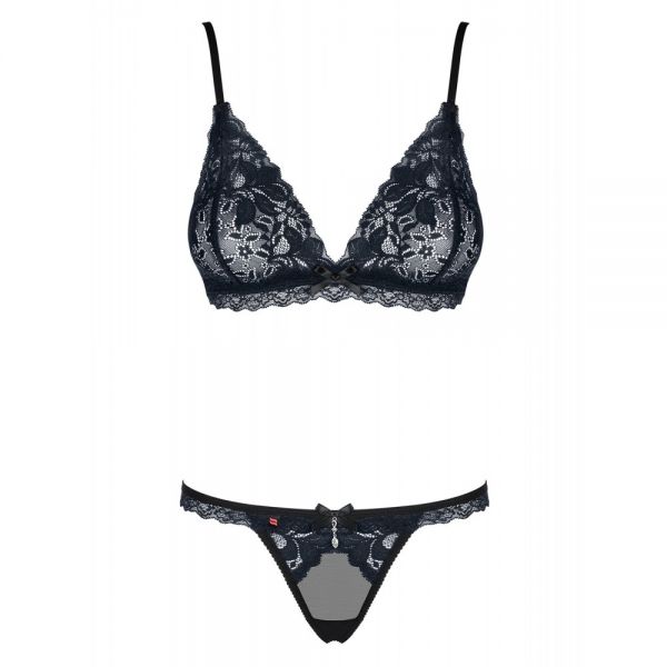 Сексуальний комплект відмінно підійде для чарівної спокусниці! бюстгалтер благородного темно-синього кольору з чорним мереживом має м’яку чашку, яка відмінно підкреслить груди, регульовані бретелі дозволять зафіксувати його так як комфортно вам. витончені напівпрозорі стрінги з мереживною обробкою і маленькою прикрасою зроблять акцент на зоні бікіні. повірте, в такій білизні ви будете виглядати неймовірно спокусливо!