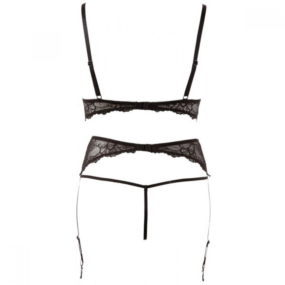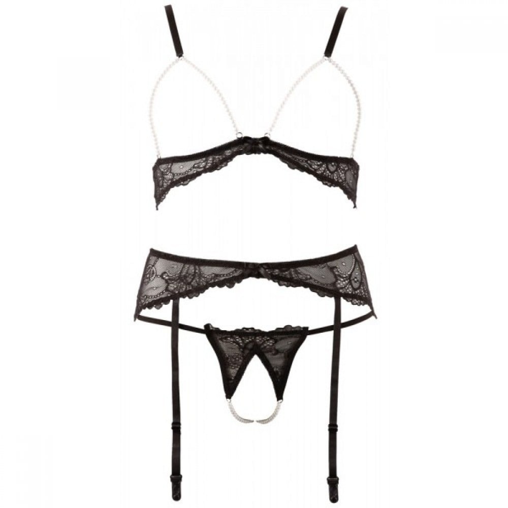 Еротичний комплект з відкритими грудьми та інтимним вирізом, з перлами, мереживним, 3 предмети, Bra Set Pearls чорний, розмір M