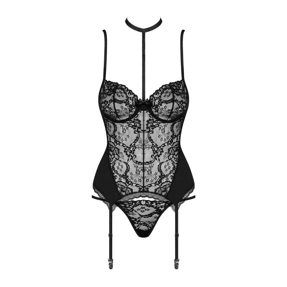 Корсет мереживний Obsessive Raquelia, L/Xl, зі стрінгами в комплекті, чорний зустрічайте зухвалий і дуже жіночний корсет із колекції raquelia від бренду obsessive! декольте, підкреслене класичним знімним чокером, буде центром уваги вашого партнера. напівпрозоре мереживо, прикрашене квітковим візерунком, ідеально обійме ваше тіло, підкреслюючи всі спокусливі вигини. блискуча прикраса між грудьми та чуттєва зав' язка на спині – увага до деталей просто вражає! У комплект також входять багато прикрашені мереживні стрінги, які завершать вечірній образ. Мережевий корсет у комплекті з чорними стрінгами може стати ідеальним подарунком. Особливості: Сміливе знімне кольє та бантик між грудьми. чуттєві аксесуари. шнурівка на спині. регульовані лямки та ремені для панчіх – ідеальна посадка. Кісточки у чашках – м' яко формують бюст. Елегантні прикраси — блискучий камінь спереду, невеликий бантик ззаду та приємна на дотик тканина. Склад тканини: 90% поліамід, 10% еластан. Ви можете носити корсет під одягом, щоб підкреслити фігуру, або використовувати це вбрання як особливий елемент прелюдії. Доповніть свій образ сексуальними панчохами.