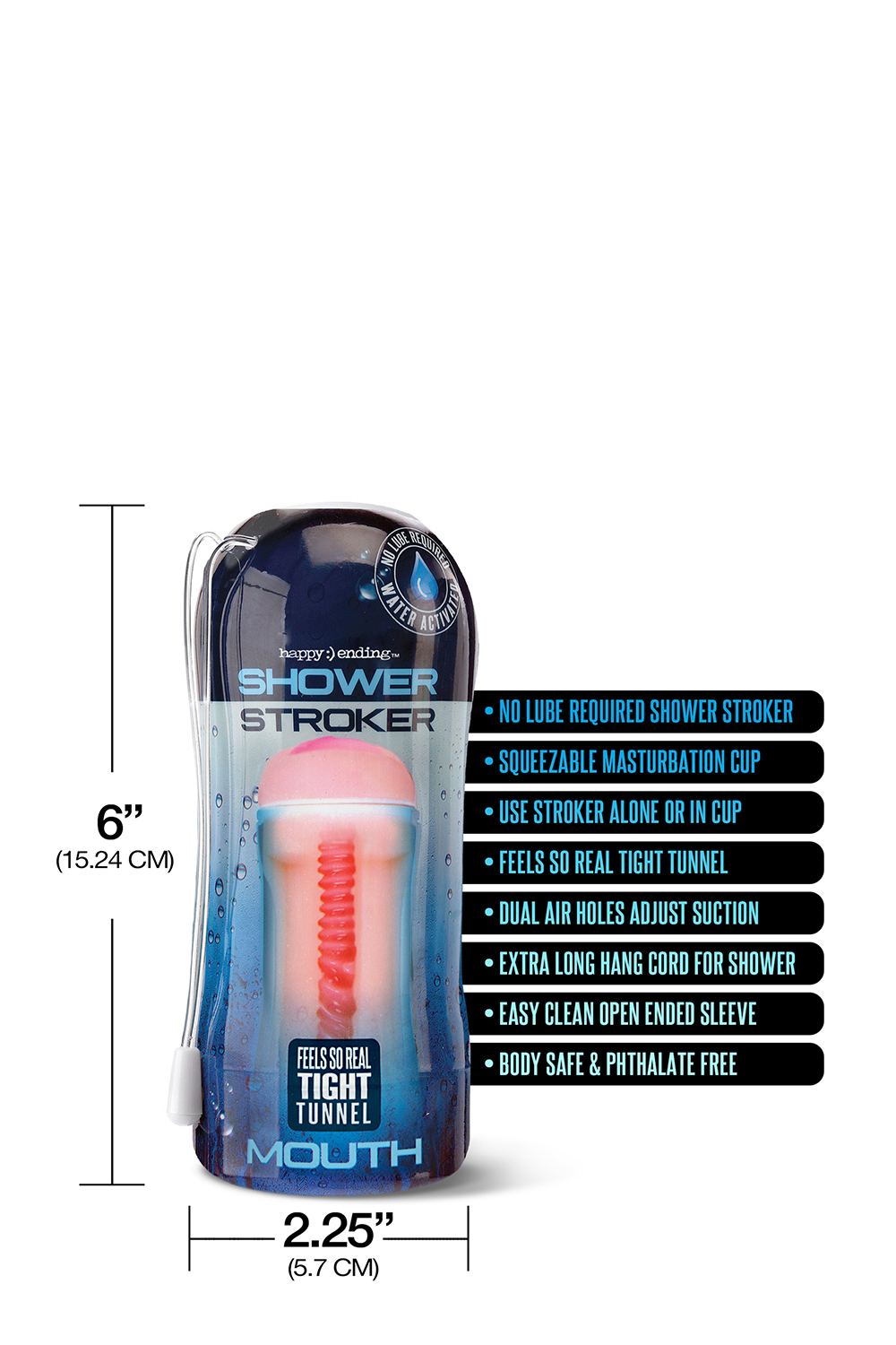 Мастило для душу не потрібно. Використовуйте погладжувач окремо або в чашці, що стискається для мастурбації. Вузький тунель здається таким реальним та має подвійні отвори для повітря, які регулюють всмоктування. Дуже довгий шнур для душу. Легко очищуваний рукав з відкритим кінцем. Безпечний для тіла і не містить фталатів.