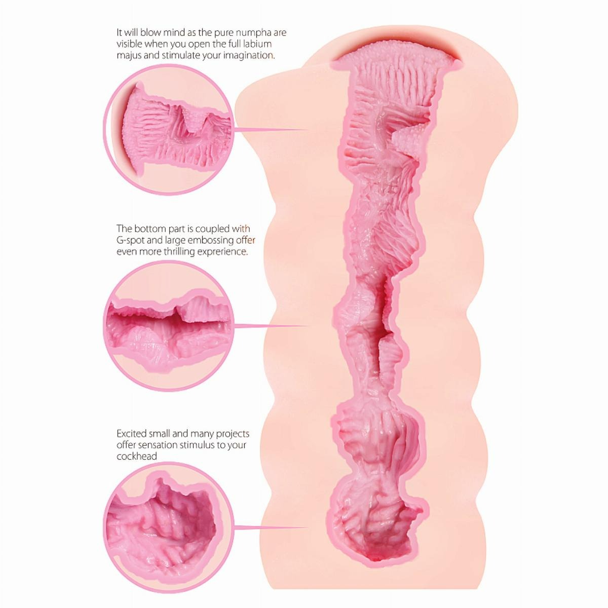 Вагіна виконана в реалістичному вигляді, має злегка пухкі і розімкнуті статеві губки, які викликають збудження навіть під час швидкоплинного погляду на них.