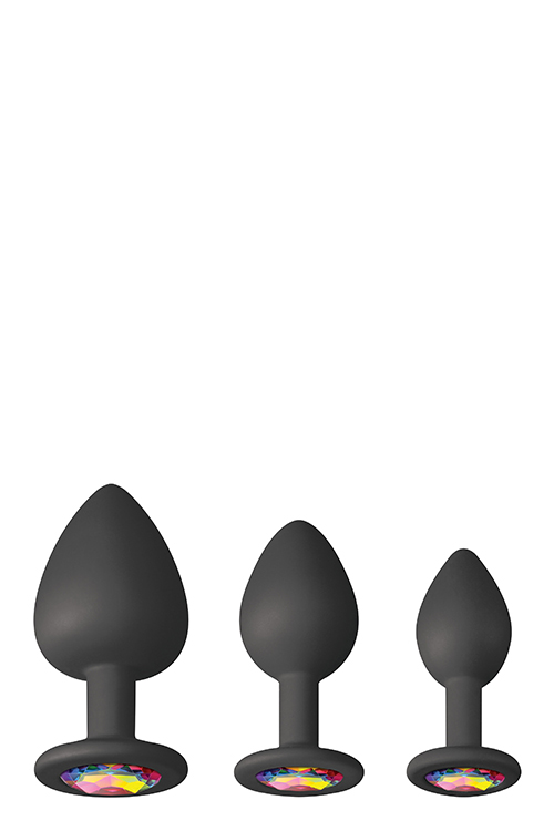 Насолоджуйтесь брязкальцями чорного ходу з набором із трьох прикрашених дорогоцінним камінням силіконових пробок Glam. Елегантно зроблені, кожна з яких створена для комфорту та веселощів та прикрашена блискучим райдужним каменем. Підходить для всіх мастильних матеріалів.