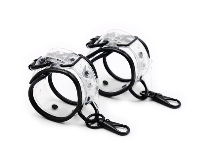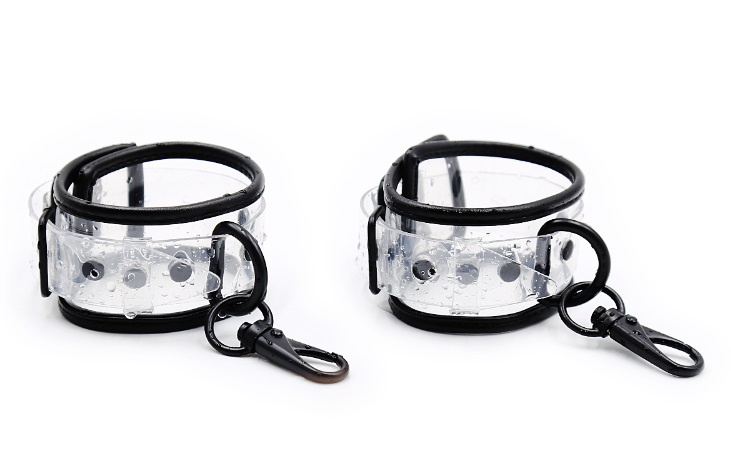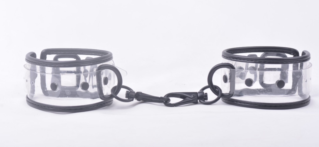 Підкоряйтеся бажанням свого партнера за допомогою цих прозорих ПВХ манжет із чорною окантовкою, пряжкою та металевими застібками.