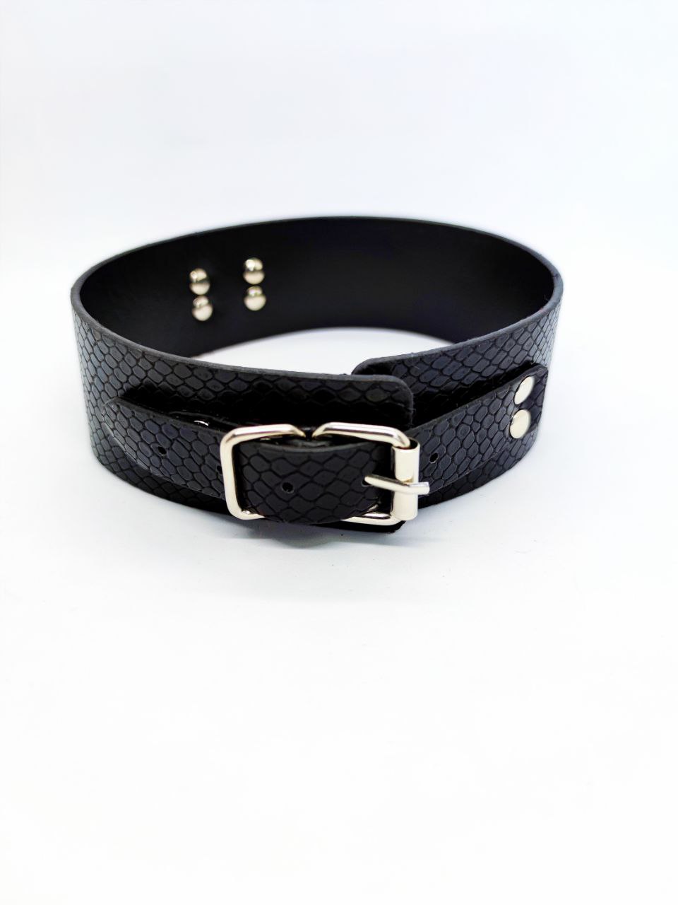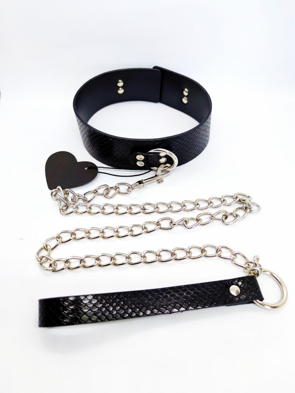 Цей набір DS Fetish Collar with leash black має гладкий і блискучий візерунок з тисненням в чорному кольорі.