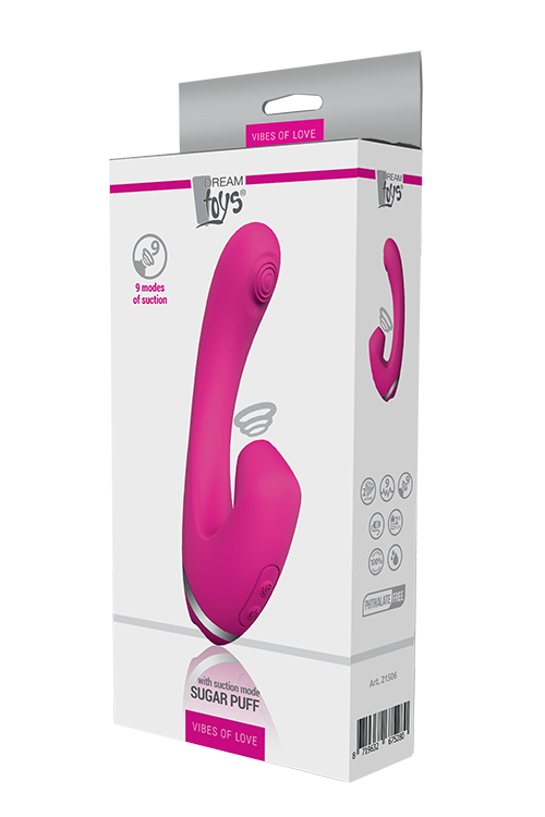 Вібратор Sugar Puff може вібрувати в 9 різних режимах, має спеціальну точку на кінчику для стимуляції точки G та спеціально обладнаний для стимуляції клітора. Стимулятор клітора має 9 режимів всмоктування, які імітують оральне ссання, забезпечуючи безліч екстатичних моментів. Яскраво-рожевий вібратор виготовлений із безпечного для тіла силікону та керується двома кнопками на основі.