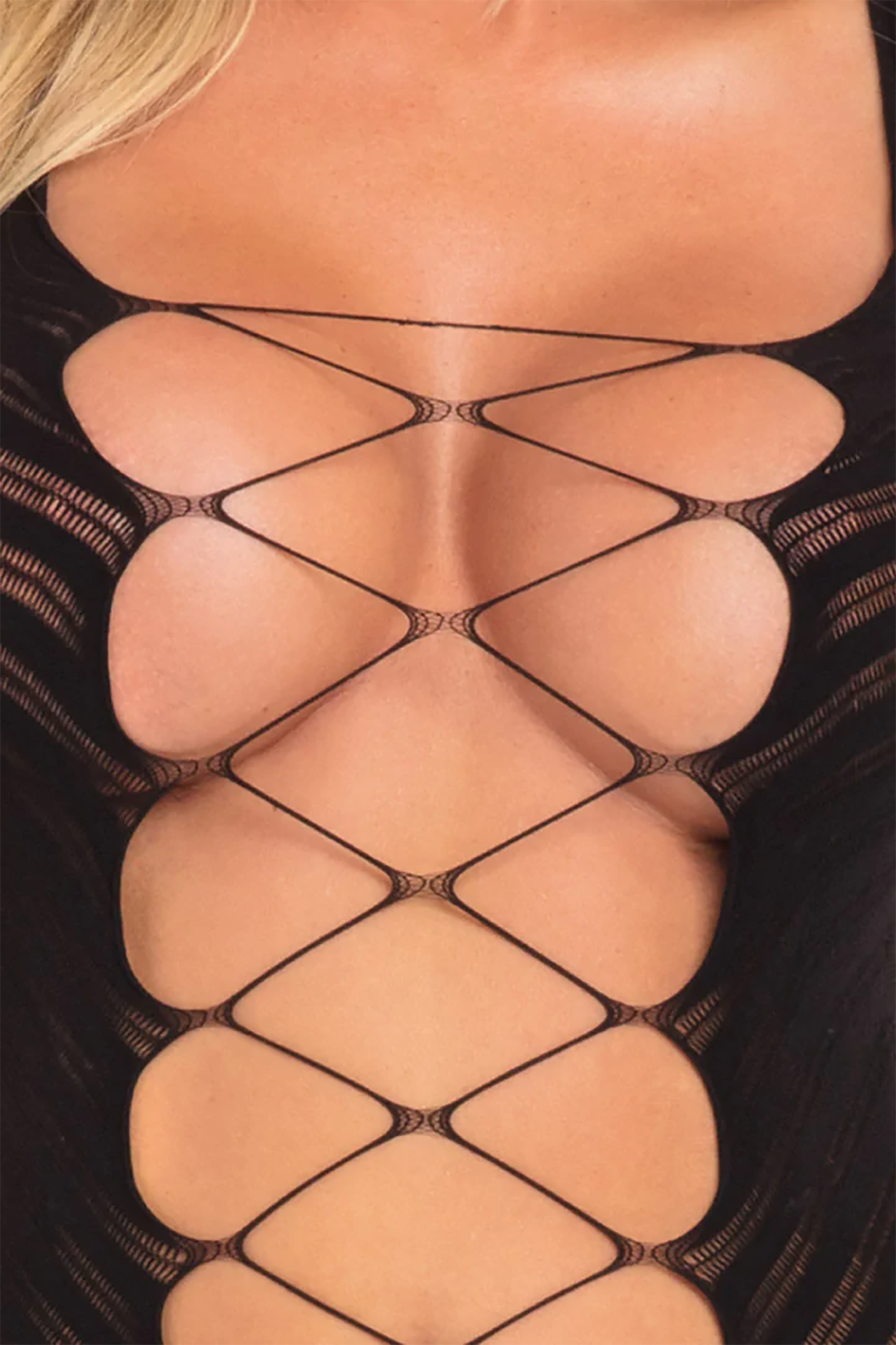 Стати єдиним цілим з чистою чуттєвістю і незайманою сексуальністю, одягнувши відкриту міні-сукню з вертикальною фіксацією, щоб підкреслити свою природну красу. Відмінною рисою міні-сукні є смілива відкрита сітка, яка дозволяє вам оголювати великі ділянки тіла.
