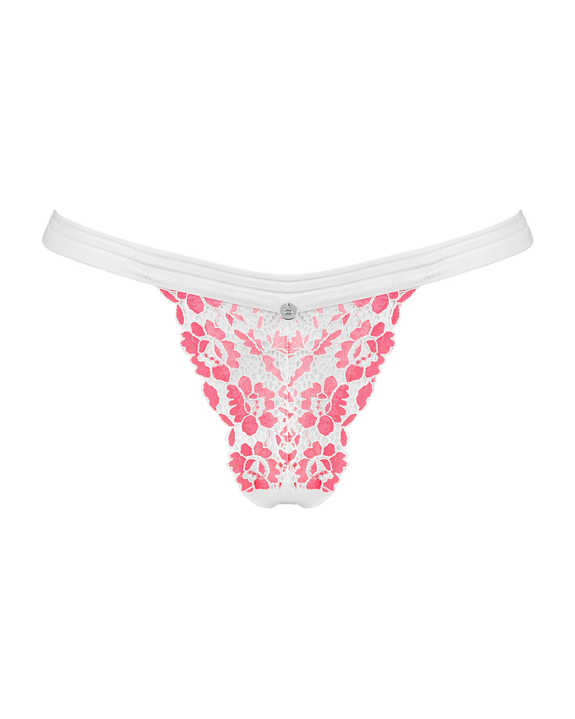 Трусики з колекції Bloomys з елегантним квітковим мереживним візерунком спереду та на сідницях. Контраст рожевого та білого підкреслить відтінок шкіри. Тонкий пояс навколо стегон забезпечить сексуальний вигляд фігури. Делікатні матеріали дозволять вам насолоджуватися повним комфортом та зручністю навіть щодня. Срібний кулон спереду додасть характеру всьому виробу.