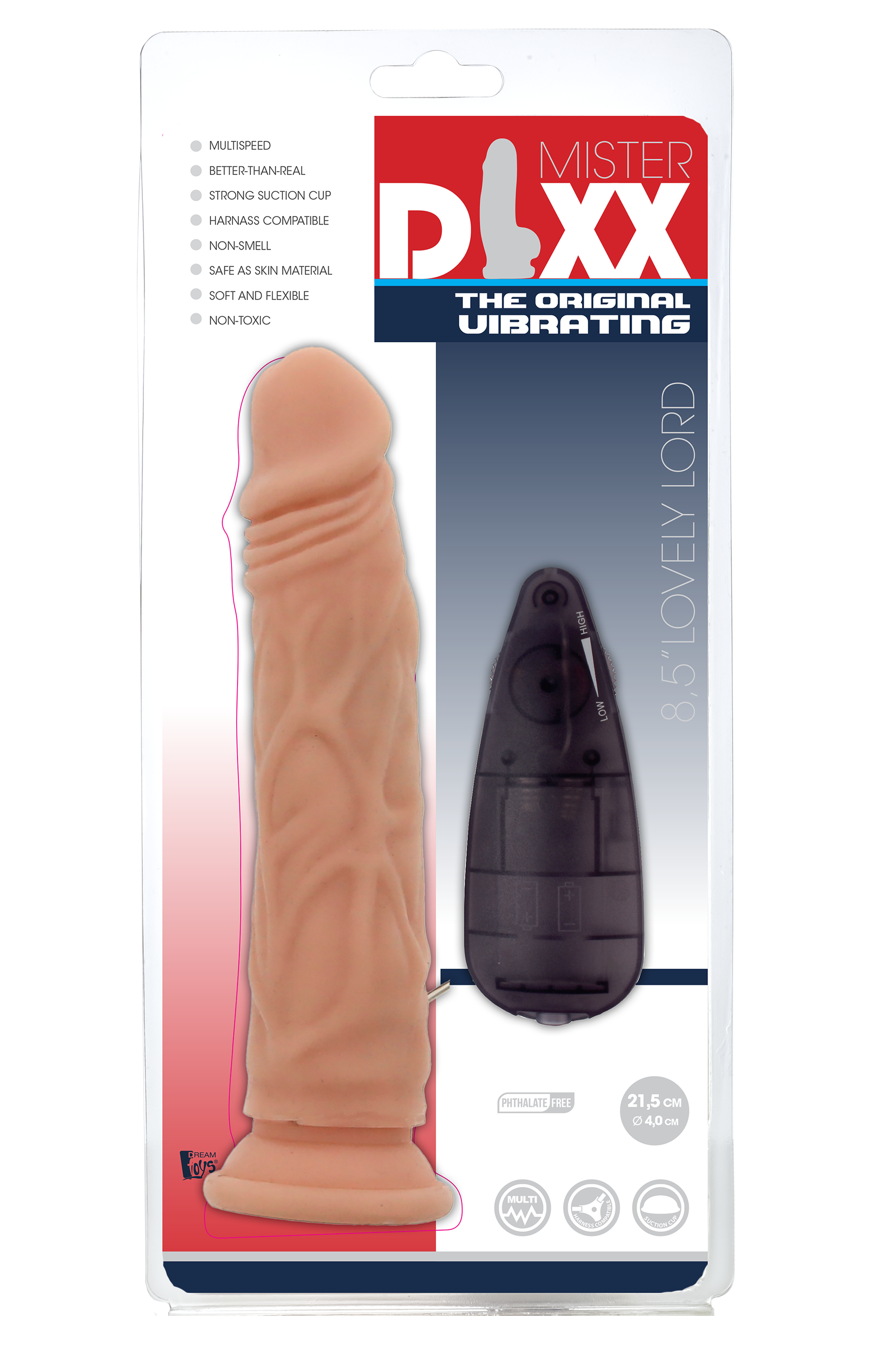 Цей 8,5-дюймовий фалоімітатор Mr Dixx гнучкий та реалістичний. Фалоімітатор має сильні багатошвидкісні вібрації, які регулюються безступінчасто за допомогою пульта дистанційного керування. Міцна основа на присосці надійно прилипає до будь-якої гладкої плоскої поверхні. Цей фалоімітатор сумісний із ременями безпеки. Виготовлений з антибактеріального ПВХ, не містить фталатів та латексу, не має запаху та безпечний для тіла.